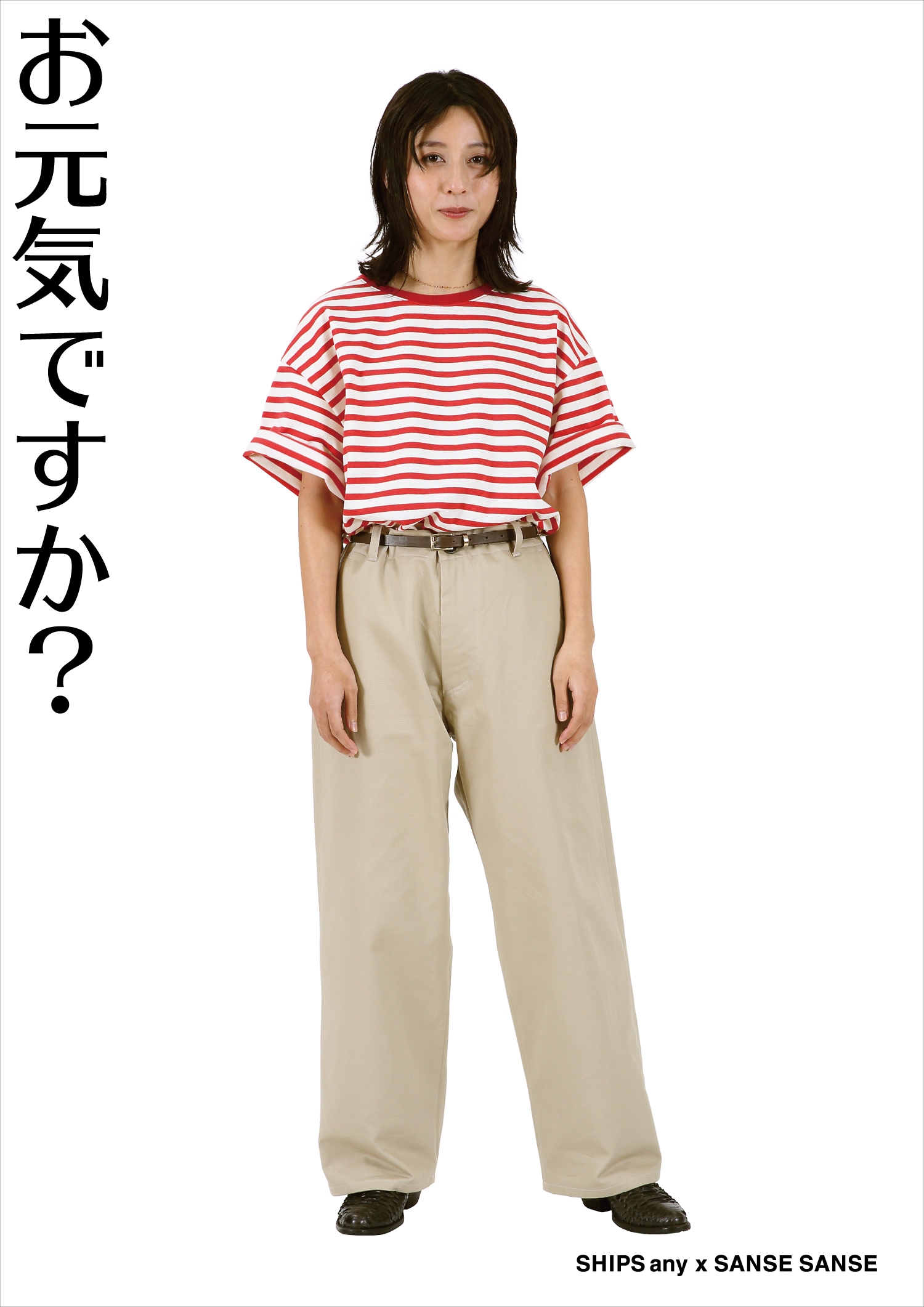 いつものSANSE SANSEより少しお求めやすいプライスで用意させてもらいました。ハンバーガー屋さんで「ハンバーガー!ポテト!コーラ!」とオーダーするように、「ストライプシャツ!ボーダーT!チノパン!」とSHIPS anyのレジ前で気軽に言ってもらえたら嬉しいです。そして、少しだけ新しい装いを手に入れて、春の心地良い日常を楽しんでもらえればと思います。