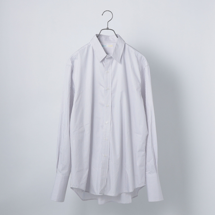 ダブルカフス仕様にあえて袖口のカフスボタンを外したストライプシャツ。カフスボタンを付けずに袖丈を長めにしても、ざっくりとラフに折り返して着用しても、一枚でサマになります。ゆとりのあるサイズ感ですが、あえて大きめに着て、女性も楽しめます。