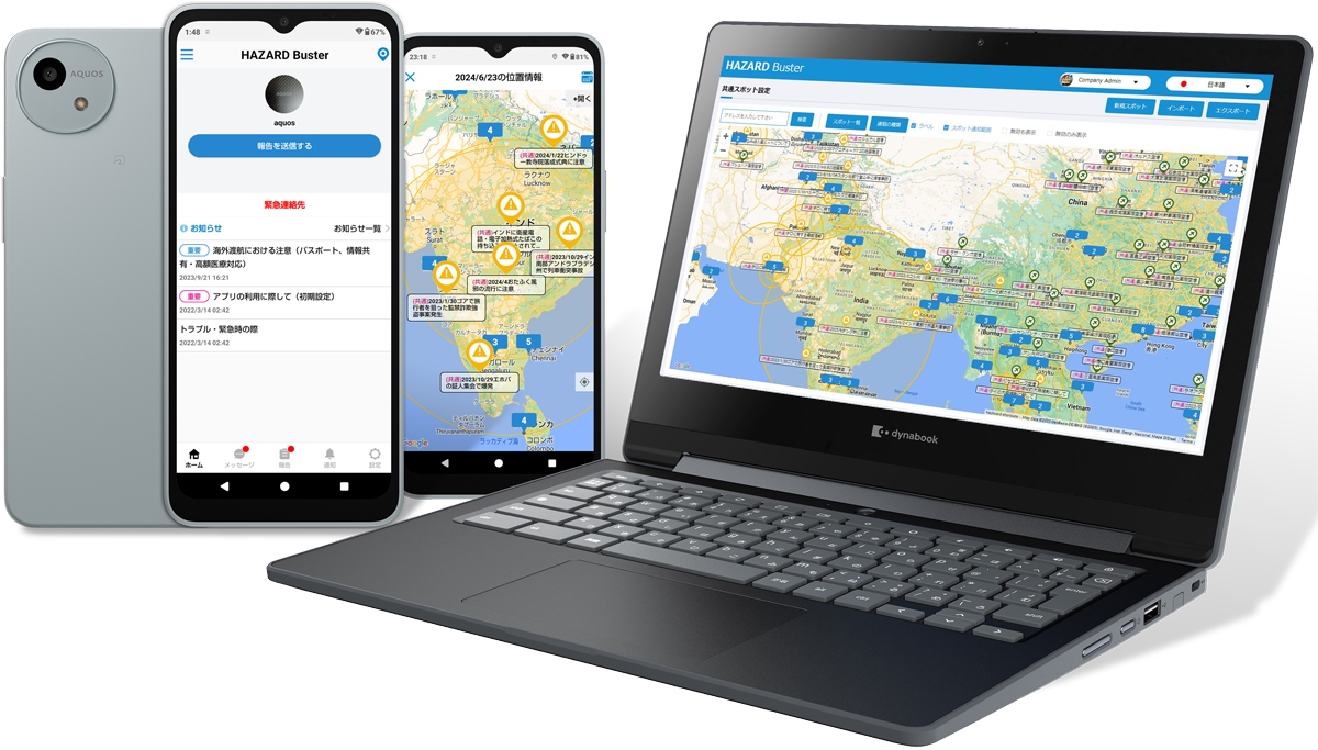 HAZARD Busterは、多機能を一つのアプリ(クラウド)に凝縮したサービスで、インターネットに接続されたパソコン(Webブラウザ)とスマートフォン(タブレット)があればご利用いただけます。パソコン側で設定した各情報がアプリ側に反映・共有され、アプリ側から送られる位置情報・報告がパソコン側に集約されます。