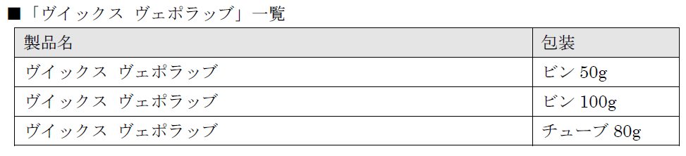 大正製薬株式会社[本社:東京都豊島区、社長:上原 茂](以下、当社)は、塗るかぜ薬ブランド「ヴイックス ヴェポラッブ」全製品につきまして、2025年9月30日(火)をもちまして、当社からの販売を終了させていただくことになりましたのでお知らせいたします。