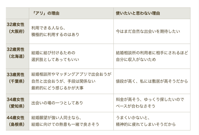 こうして比べてみると、「結婚相談所はパートナー探しとしてアリ」という回答は「一般的に婚活としてどうなのか?」という観点での回答となっており、「使いたいと思わない理由」は「実際に自分が婚活として活用するとしたらどうなのか?」という観点になっていることがわかります。