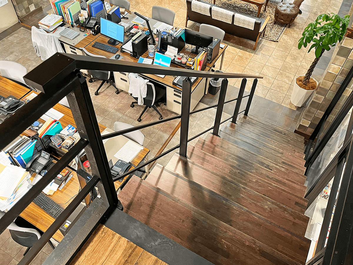 ドラマセットのTWO BEAMは、踏板を支える二本の桁は艶消しブラック、踏板は艶消しダークブラウンを選択。倉庫をリノベーションしたようなおしゃれなオフィスにテイストを合わせた“男前”な階段となっています。