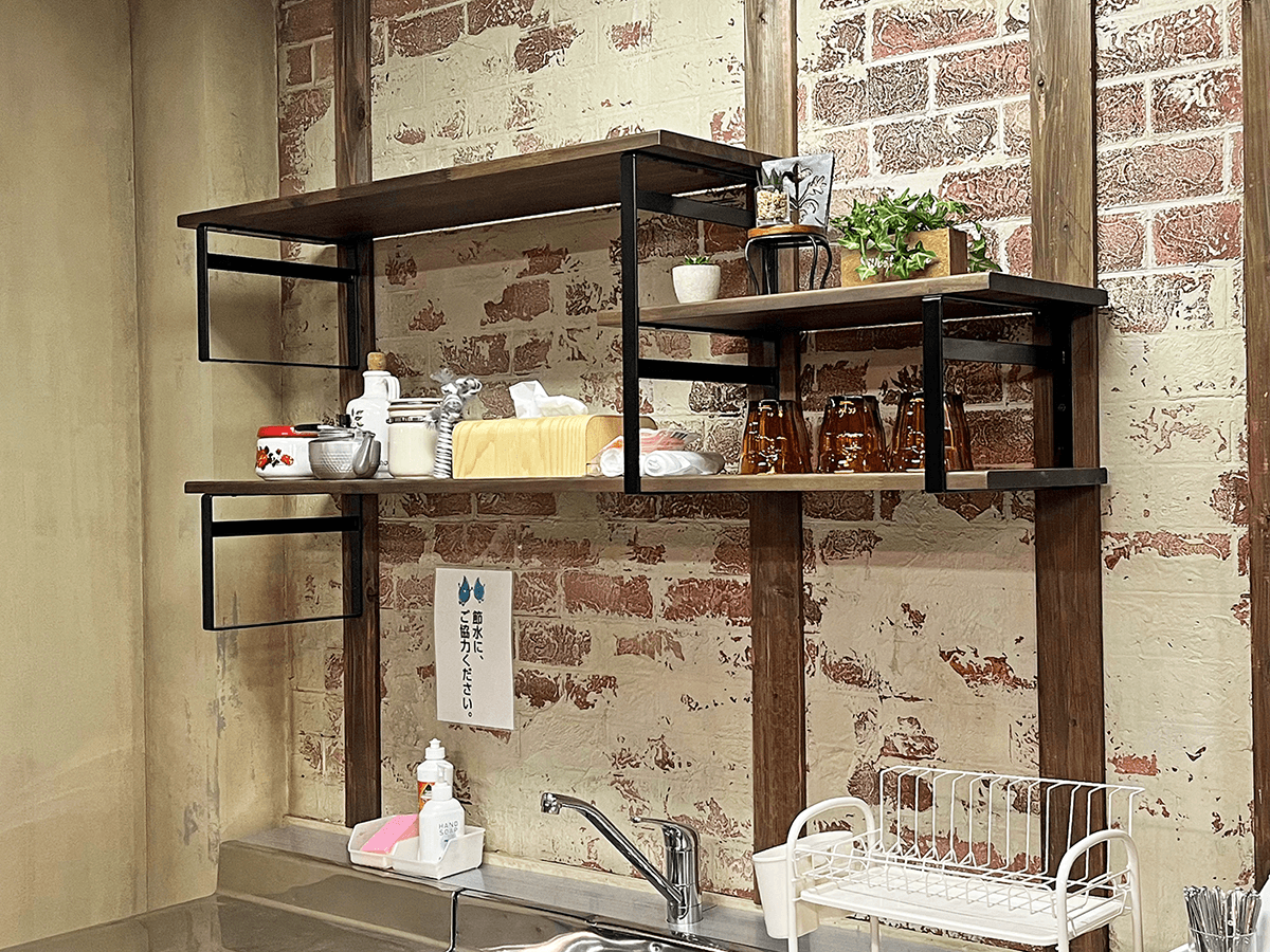 給湯スペースのテイストに合わせ、アカシア材ダーク色の棚板を使った組み合わせセットが設置されています。