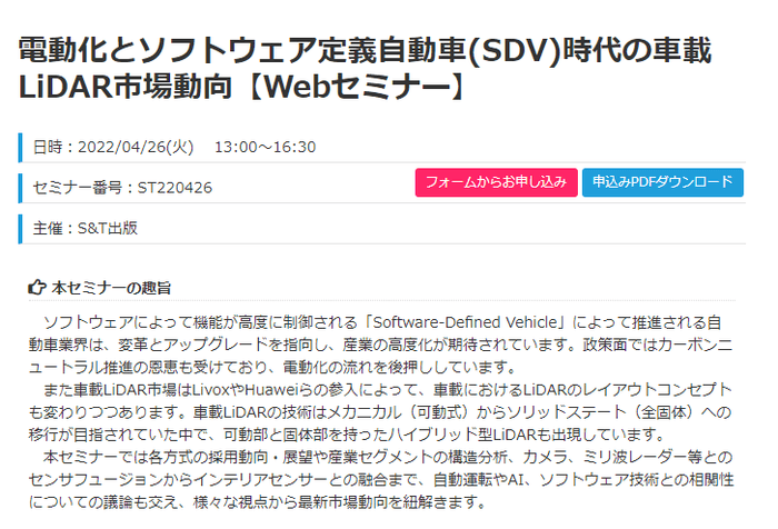 S&T出版社主催で「電動化とソフトウェア定義自動車(SDV)時代の車載LiDAR市場動向【Webセミナー】」と題したセミナーで2022年4月26日に講演することが決まりましたのでご報告申し上げます。