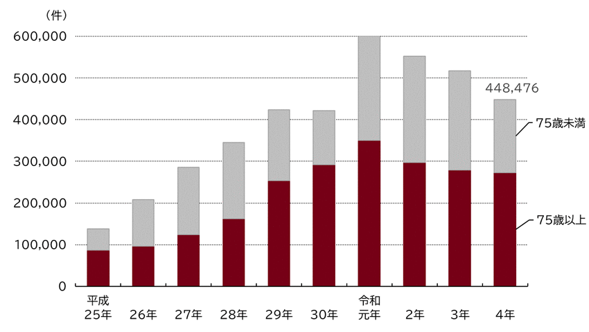 令和4年の運転免許の自主返納の申請件数は448,476件となります。運転免許の自主返納後は、申請により公的な身分証明書としても使える「運転経歴証明書」が交付され、それを提示することにより、自治体や事業者などによる様々なサービスを受けることができます。(タクシーやバスを割引運賃で利用できるなど様々な特典あります。)