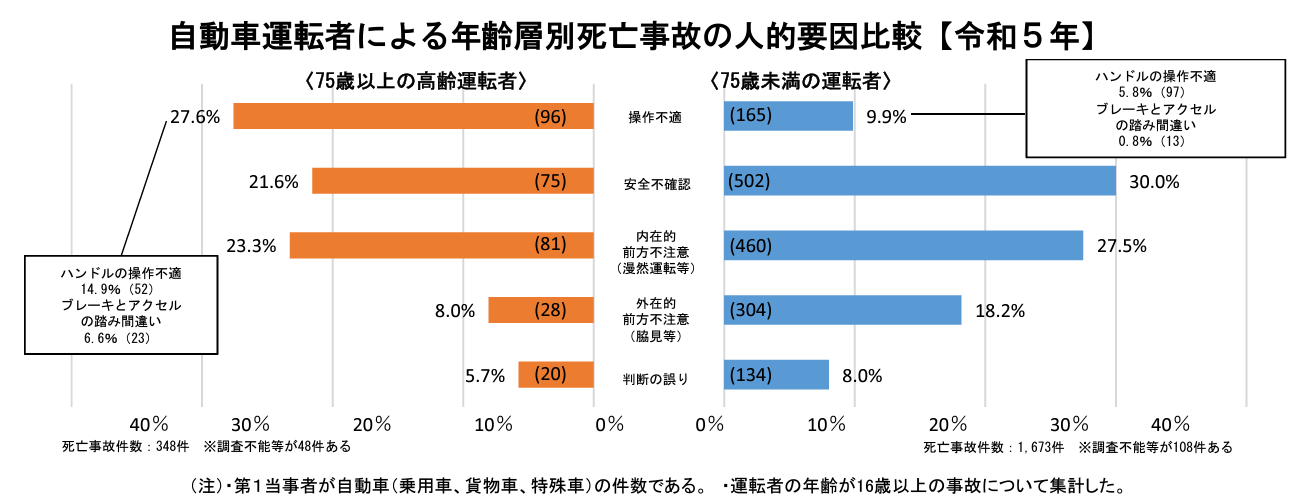 75歳以上の運転者による人的要因として多いものは、ブレーキとアクセルの踏み間違いなどの「操作不適」が多く全体の約3割を占めています。