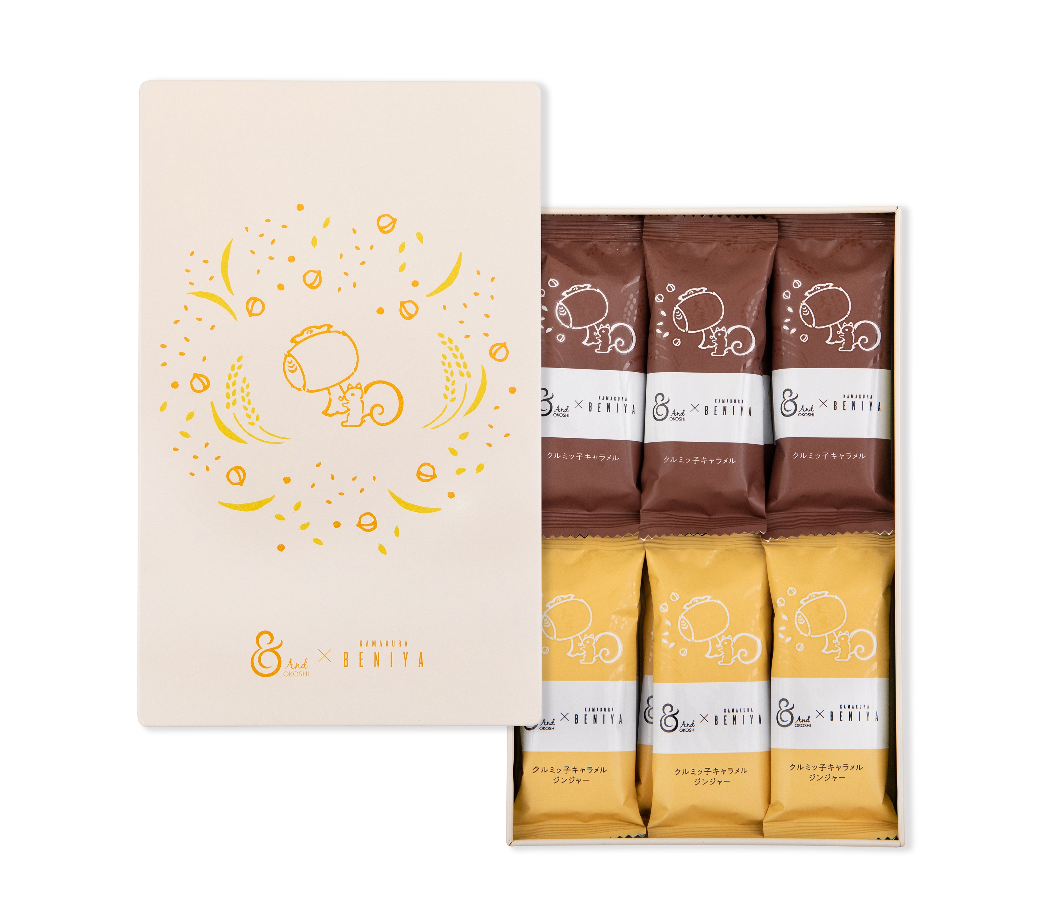 やわらかな色調のトーンでまとめた缶に、「& OKOSHI」ブランドを展開する、あみだ池大黒のシンボルマーク「打ち出の小づち」と、それを振る鎌倉紅谷のシンボルキャラクター「リスくん」の様子を描き、両社のコラボレーションと素材が生きるおこしの魅力を表現しました。