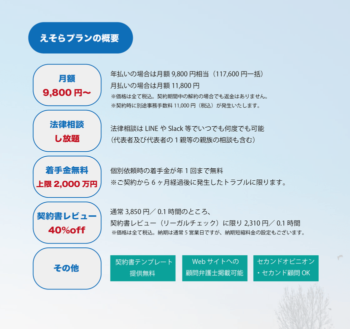 「顧問弁護士契約えそらプラン」の詳細はこちら。