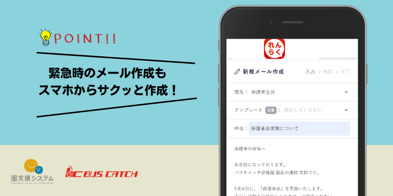 園にいない時や遠足中のトラブルなど、緊急でメールを送る際に、スマホサイトで簡単に作成ができるようになりました。