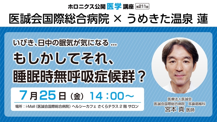 医療法人医誠会(本社:大阪府大阪市、代表者:谷 幸治)は、2025年7月25日(金)に、提携施設である「うめきた温泉 蓮 Wellbeing Park」(総支配人:藤立 達哉、所在地:大阪市)にて公開医学講座と骨密度検査を開催いたします。今回は医誠会国際総合病院 耳鼻咽喉科の宮本 真 医師が「睡眠時無呼吸症候群」についてわかりやすく解説。さらに、骨の健康チェックとして「骨密度検査」も同時実施します。日々の不調のヒントを得られるこの機会、ぜひご参加ください。参加費は無料、ぜひお気軽にご参加ください(入館料別途要)。