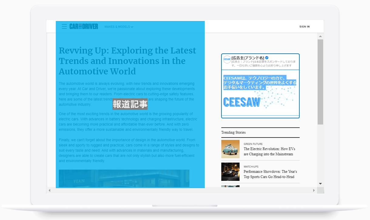 そのため、株式会社CEESAWでは、サプライサイドの事業者と提携して、信頼ある報道機関の災害関連記事を見ている消費者が広告を見ることで広告費の一部を寄付することができる広告配信プログラムをリリースいたしました。広告主・広告代理店にとっては、これまで配信してきた運用型広告の配信面を見直していただくだけで、災害復興支援のための義援金を寄付することができるようになります。