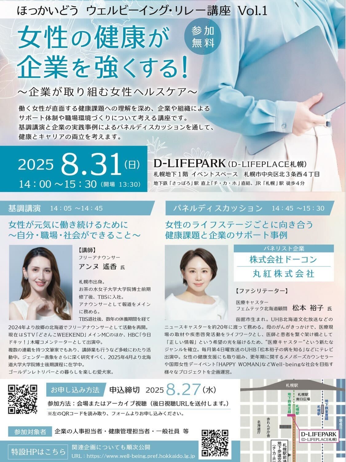 北海道庁が2025年8月31日(日)に札幌市地下歩行空間で開催する「ほっかいどう ウェルビーイング・リレー講座 Vol.1」で、一般社団法人フェムテック北海道顧問の松本 裕子がファシリテーターを務めます。(参加無料)