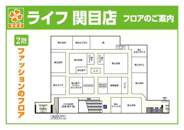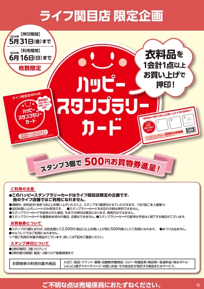ライフ関目店限定企画として、「ハッピースタンプラリーカード」を配布しております。期間中、ライフ関目店で衣料品を1点以上お買い上げいただくと、スタンプを1個押印させていただきます。スタンプ3個で500円分のお買物券を進呈いたします。詳しくは店頭ポスターをご確認ください。