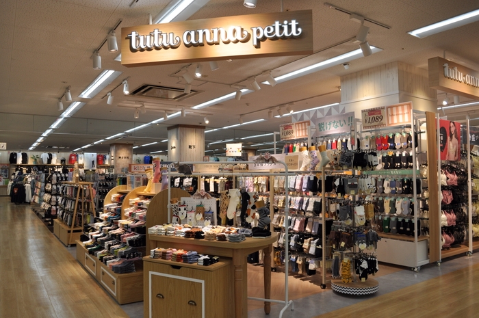 まるで専門店のような広々とした売り場で、有名ブランド「tutuanna」の靴下やパジャマ、肌着を種類豊富に取り扱いいたします。