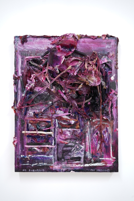 制作に用いる素材は、絵の具のほか、レディース/メンズといった二分的ラベリングを伴う衣服や靴、雑貨など、市場に流通する事物である。これらは単なる消費財ではなく、身体のあり方や振る舞いを社会的に規定する装置として機能している。私は絵画という制度の内部において、これらの事物がいかにジェンダー化された意味作用を帯び、再生産されていくのかを可視化することを試みている。