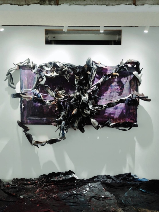 ジェンダーとは本質的属性ではなく、社会的規範に従って反復されるパフォーマティヴな行為の累積として生成されるものである。私の作品における絵の具の堆積や、日用品(ヒールなど)の埋め込みは、その生成過程の痕跡であり、同時に社会的規範が身体に刻み込む記号の物質的顕現でもある。絵画表面のマティエールの厚みは、規範の反復と逸脱のあいだで揺らぐ身体性そのものを物質的に体現する。