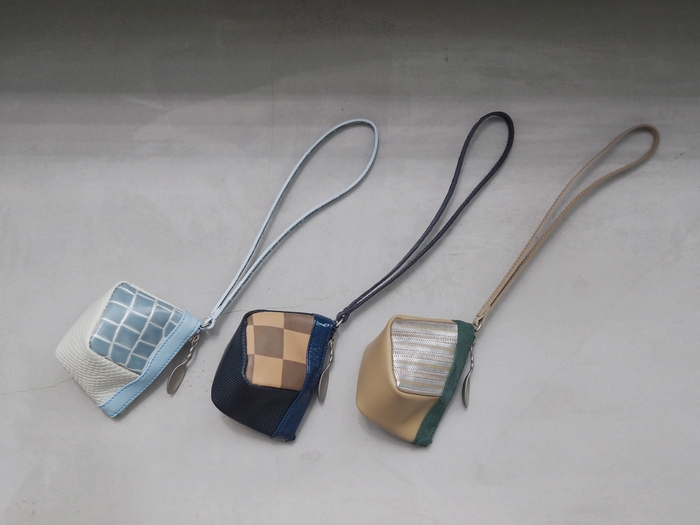 箱をたたんで平面にした遊び心のあるポーチ、チャームポーチは個性的な異素材を組み合わせ、楽しげな雰囲気。平面的に見えつつ立体感のあるだまし絵のようなユニークなつくりです。