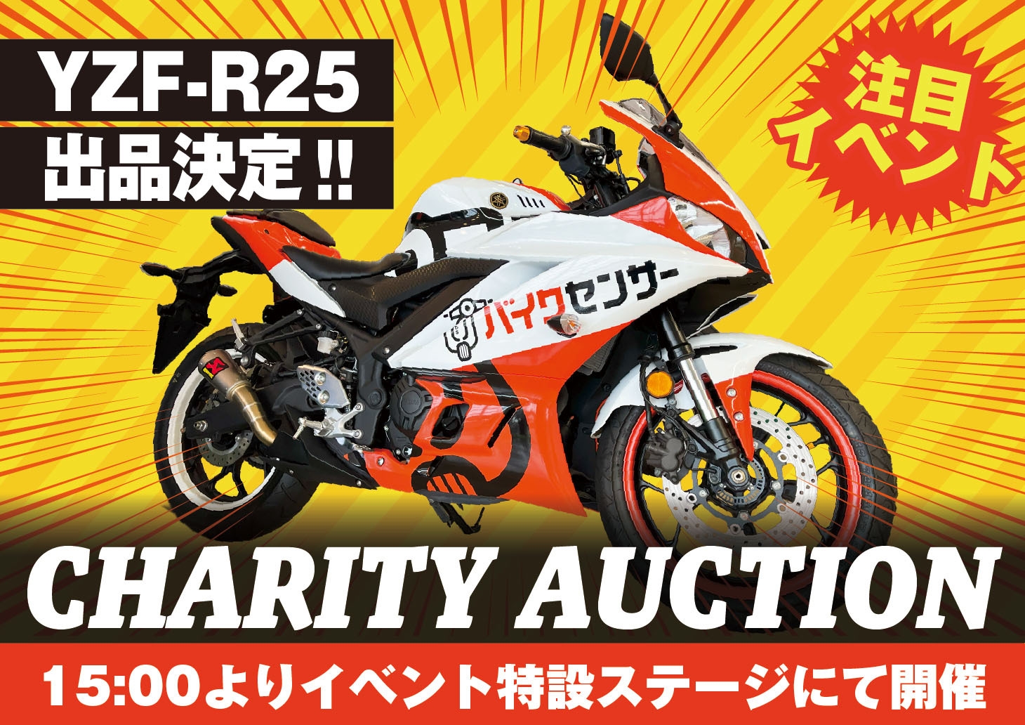 この他にも、「オフロード体験」や「キッズバイク体験」などの体験型アトラクション、BDSバイクセンサー掲載の優良バイクショップやパーツ・アパレルメーカーによる「展示即売会」、「柏の杜会場見学会」など、見どころは盛りだくさん。また、イベントの最後を締めくくるチャリティーオークションでは、目玉商品としてヤマハ「YZF-R25」が出品されるほか、カメラやヘルメットなどの豪華商品も登場。驚きのプライスでゲットできるチャンスです!