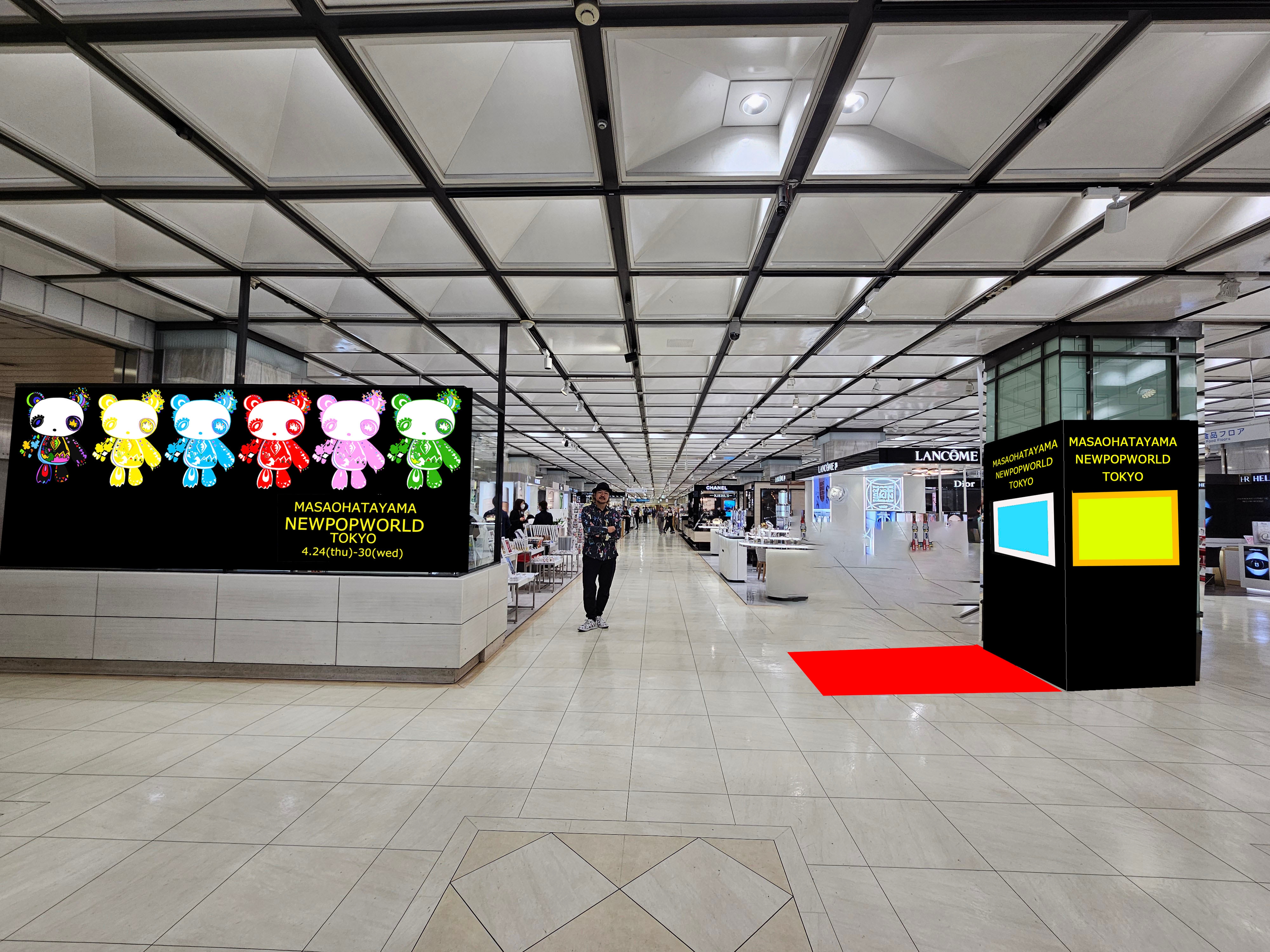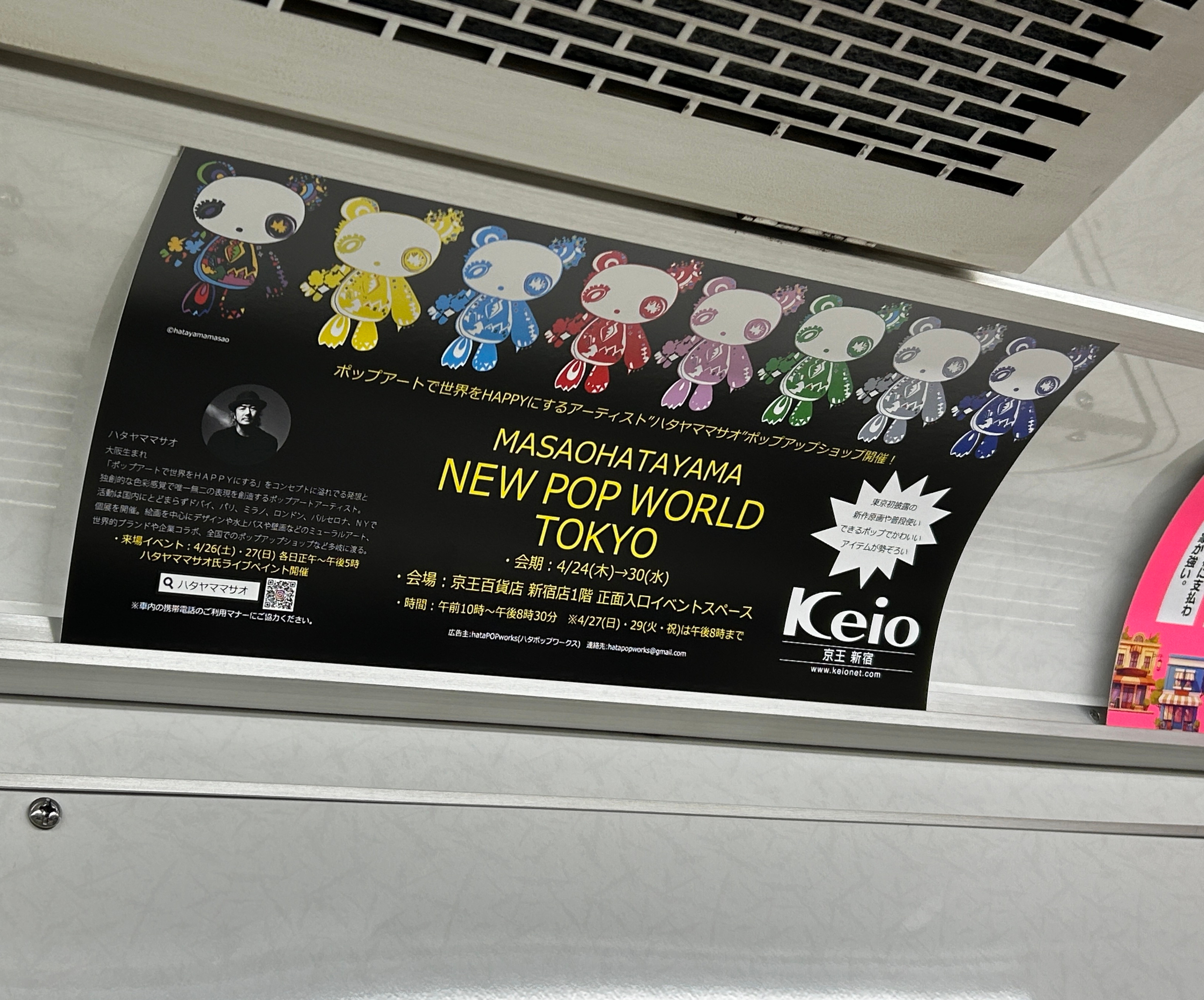 正面玄関にはハタヤマ氏のシンボル的キャラクターアート「ぱんだのぬいぐるみ」の様々なカラーバージョンをメインビジュアルにした装飾が前回よりさらにパワーアップして入口を彩ります。なお、4月16日から29日までは京王電鉄車両内に800枚に及ぶ車内広告も実施します。