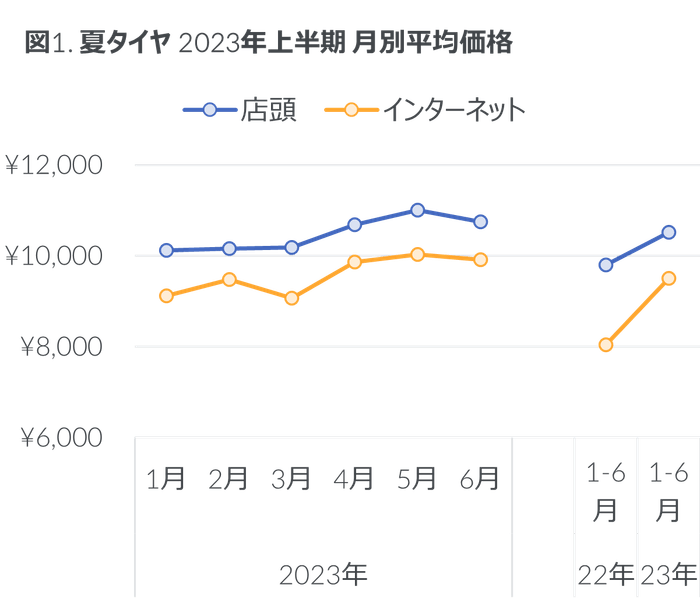 2023年上半期の数量前年比は5%減と微減であった。夏タイヤでは4月のメーカー出荷価格引き上げ前の特需はあったものの、前年ほどの盛り上がりを見せるには至らず、店頭では数量前年比7%減、インターネットでは同10%減とともにマイナス成長であった。出荷価格が引き上げられたことに伴い、店頭の平均価格は前年から7%上昇し10,516円、インターネットでは18%上昇し9,512円となった(図1)。この結果、金額前年比は店頭では前年並みに留まり、インターネットでは7%増と堅調に推移した。