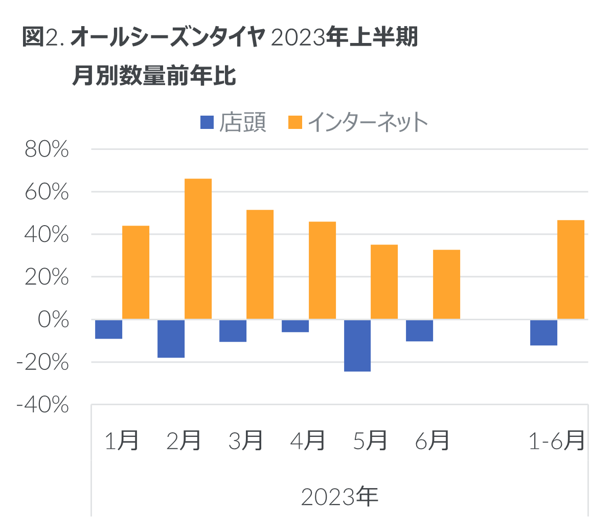 近年販売が増加しているオールシーズンタイヤは数量前年比21%増と二桁成長を見せた。店頭、インターネット別にみると、インターネットでは47%増と大きく伸長したものの、店頭では12%減と販売を落とした(図2)。