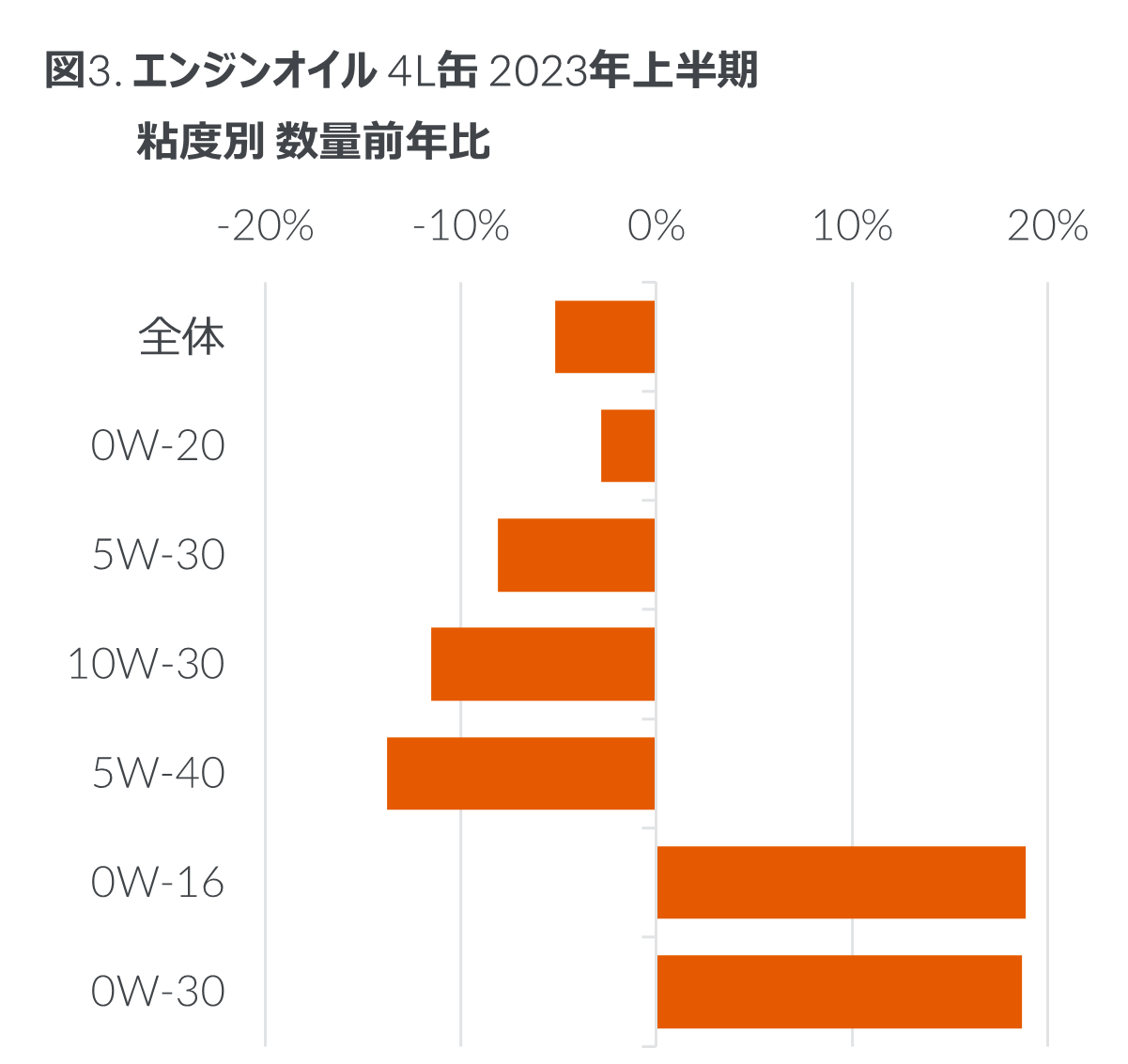 ・ エンジンオイル4L缶は数量前年比5%減のなか、粘度別に0W-16、0W-30はともに数量前年比19%増と大きく伸長した。