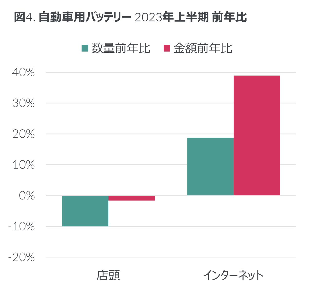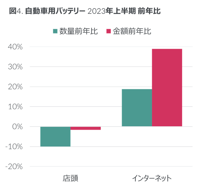 ・ 自動車用バッテリーは店頭の数量前年比が10%減と落ち込む中、インターネットでは同19%増に至った。