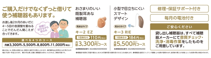 月額税込3,300円~ 定額にて補聴器を貸し出しいたします。使えるようになるか不安な方は、まずは補聴器を借りることから始めてみませんか?