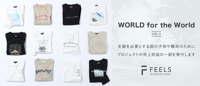 「アンタイトル」「インディヴィ」「リフレクト」「デッサン」「クード シャンス」「スーナウーナ」の6ブランドを横断させるこの企画は、フィールズインターナショナルが提案する商品を社会貢献に繋げたいという想いで、昨年7月にスタートしました。第1弾の半袖Tシャツ、第2弾の長袖Tシャツ、第3・4弾のフーディー&スウェット共にワールド オンラインストアと各ブランドの店頭で発売し好評を得ております。