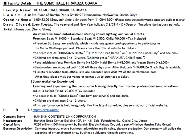 Location: THE SUMO HALL HIRAKUZA OSAKA (8th Floor, Namba Parks, 2-10-70 Nambanaka, Naniwa-ku, Osaka)