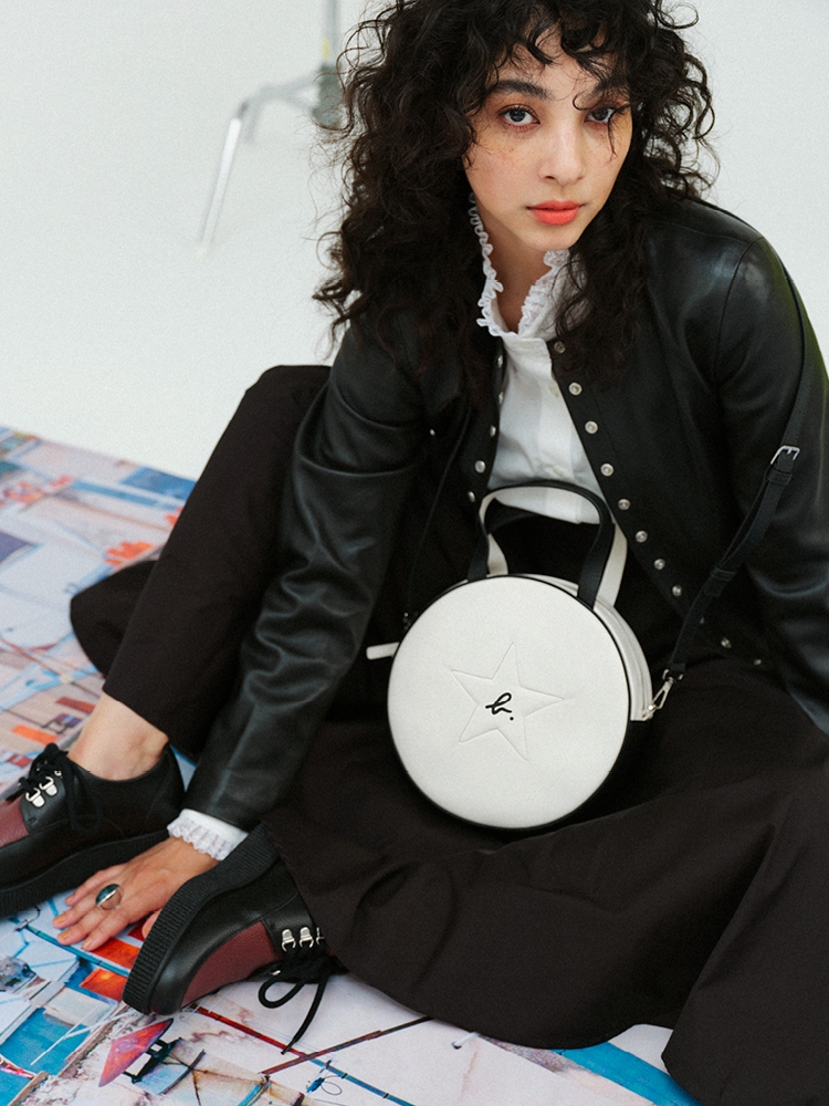 バッグラインに登場するのはサークル、スクエアのアイキャッチーなシェイプのアーカイヴモデルをアップデートしたレザーバッグ“STARLETT”と“MUSiC BOX”。ブラック&ホワイトのバイカラーに、ユニークなシルエットとエトワール(星)や“b.”のアイコニックなモチーフを用いたディテールに遊び心を散りばめました。