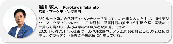 株式会社PIVOT(https://pivot.jp/)は「ユーザーの最高体験」を追及、WEBサイト制作、アプリ開発、システム開発のUXデザイン、UI改善、企画から実装、運用に至るまでワンストップでサポートさせていただいております。