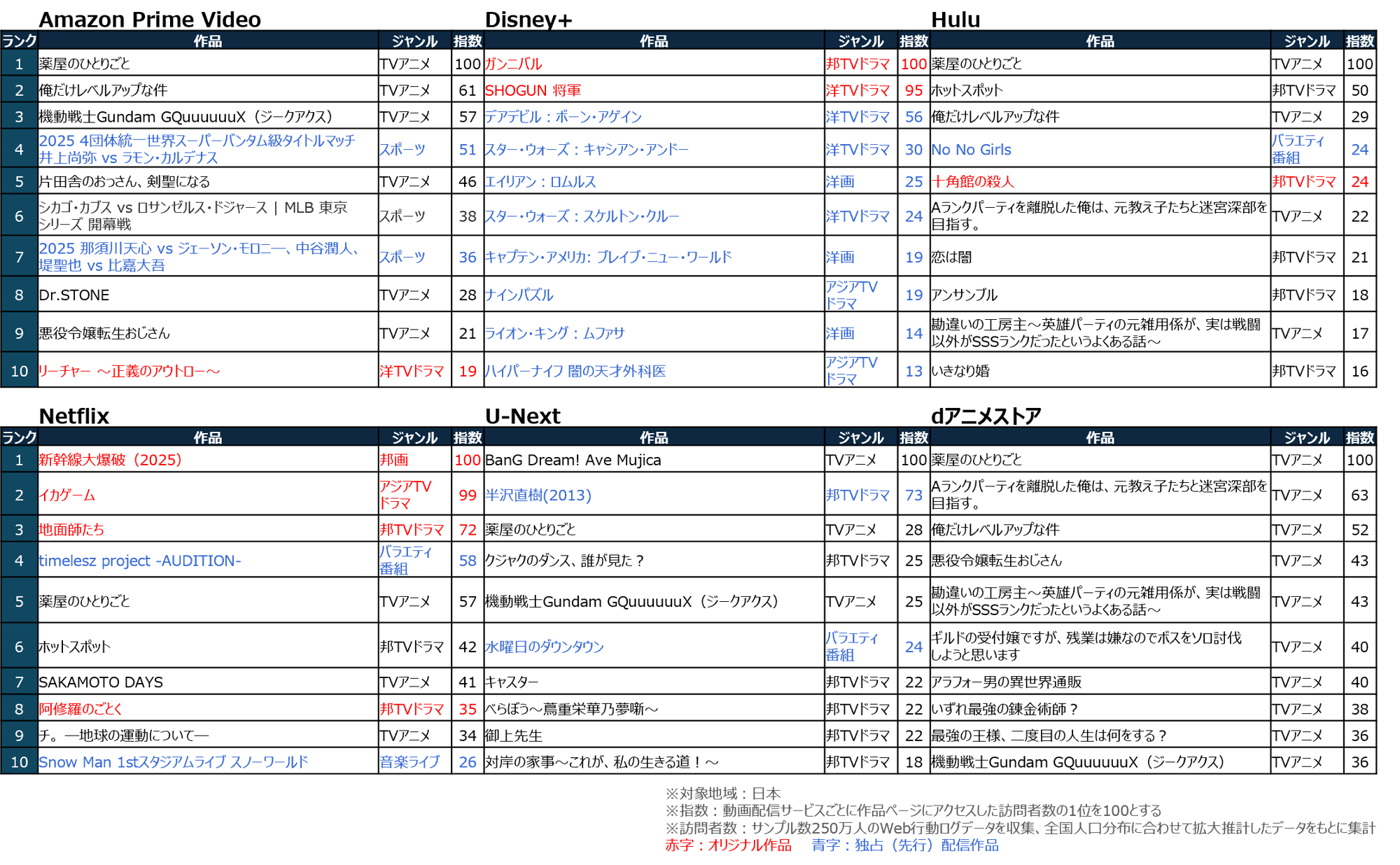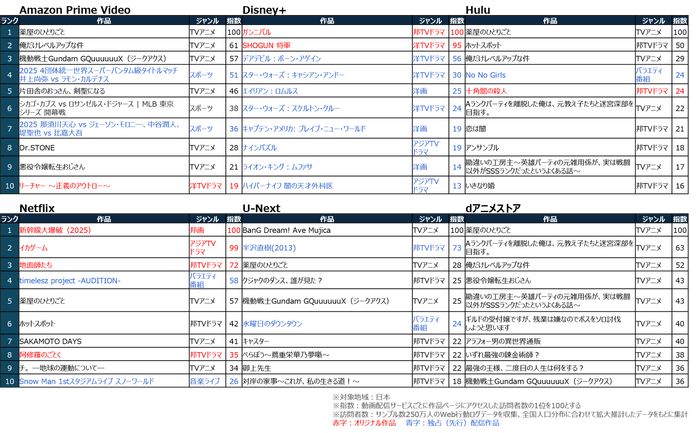 ・Disney+:「ガンニバル」、「SHOGUN 将軍」といった同社のオリジナル作品や、ウォルト・ディズニー社傘下のTVドラマや映画作品がランクイン。マーベルやスターウォーズといったコアファンが多い作品が上位を占める。
