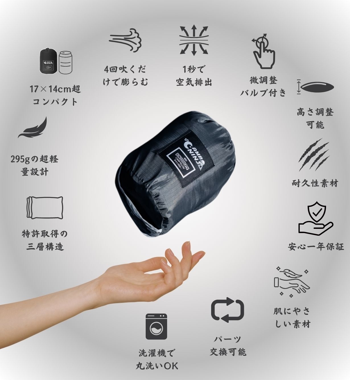 キャンプや登山、車中泊や飛行機移動、オフィスの仮眠、自宅のリビングや枕の補助として、屋外でも、日常でも。「枕を持ち運ぶ」ではなく、「眠りを持ち運ぶ」時代へ。