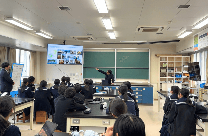 授業では、代表の竹下が40歳での起業という自身のキャリアを振り返り、創業期の苦労や困難を乗り越えるための精神について語りました。特に、日常の疑問から社会の課題を見出す「課題発見」や、周囲と協働して「行動」する重要性を、自社の事業展開を例に解説。質疑応答では「リーダーの資質」や「成功の定義」など、経営の本質に迫る鋭い質問が相次ぎ、生徒たちの真剣な姿勢が印象的な時間となりました。同校では今年度より選択授業としてアントレプレナーシップ教育を導入されており、今後も外部講師との連携を通じて、自ら新たな価値を創造できる人材の育成を継続していく展望が示されました。
