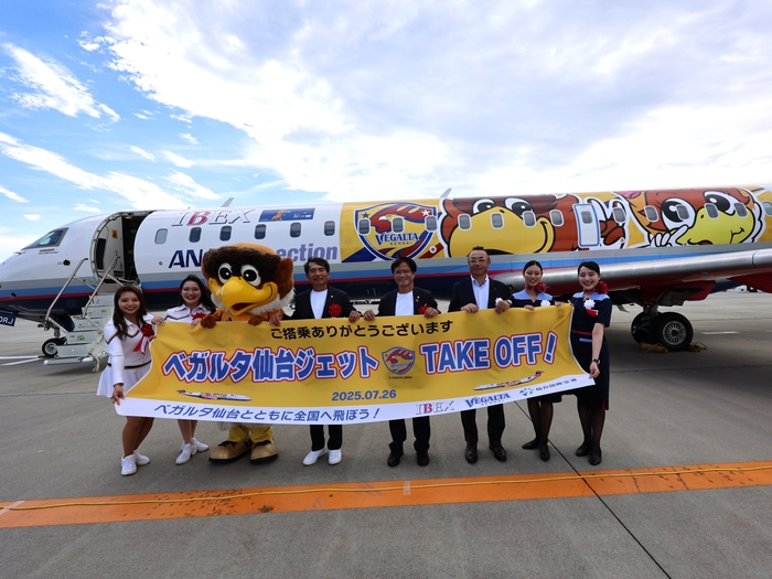 特別塗装機『ベガルタ仙台ジェット』(機体番号:JA10RJ)について、報道関係者向けお披露目を