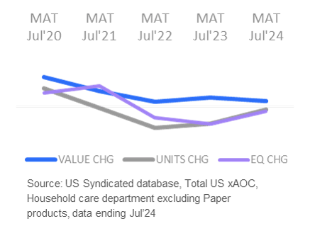 NIQ RMSデータによると、コロナ禍を通じてホームケア用品の需要が大幅に増加した。消費者の習慣が変わり、在宅での食事や料理の風潮が促進されたことが背景にある。ポストコロナ時代においては、下図のUSのように需要が減少し、伸び悩む中で各メーカーがどのように成長を続けるかが主要な課題となっている。