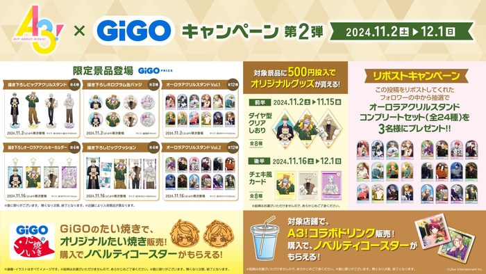 株式会社GENDA GiGO Entertainment(本社:東京都港区 代表取締役社長:二宮 一浩 以下「当社」)は2024年11月2日(土)より、GiGOグループのお店におきまして株式会社リベル・エンタテインメント(本社:東京都千代田区 代表取締役社長:林田 浩太郎)が手掛けるイケメン役者育成ゲーム『A3!』(エースリー)の描き下ろしイラストを使用したコラボキャンペーン第2弾を開催いたします。