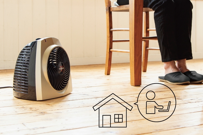 エアコンや据え置きのヒーターを設置するほどではない、ワークスペース。コンパクトで持ち運びが楽な『温風サーキュレーター』は、そんなスペースにぴったりです。温風を循環させて、足元から肩まで包み込むように暖めるので、のぼせることもなく在宅ワークがはかどります。