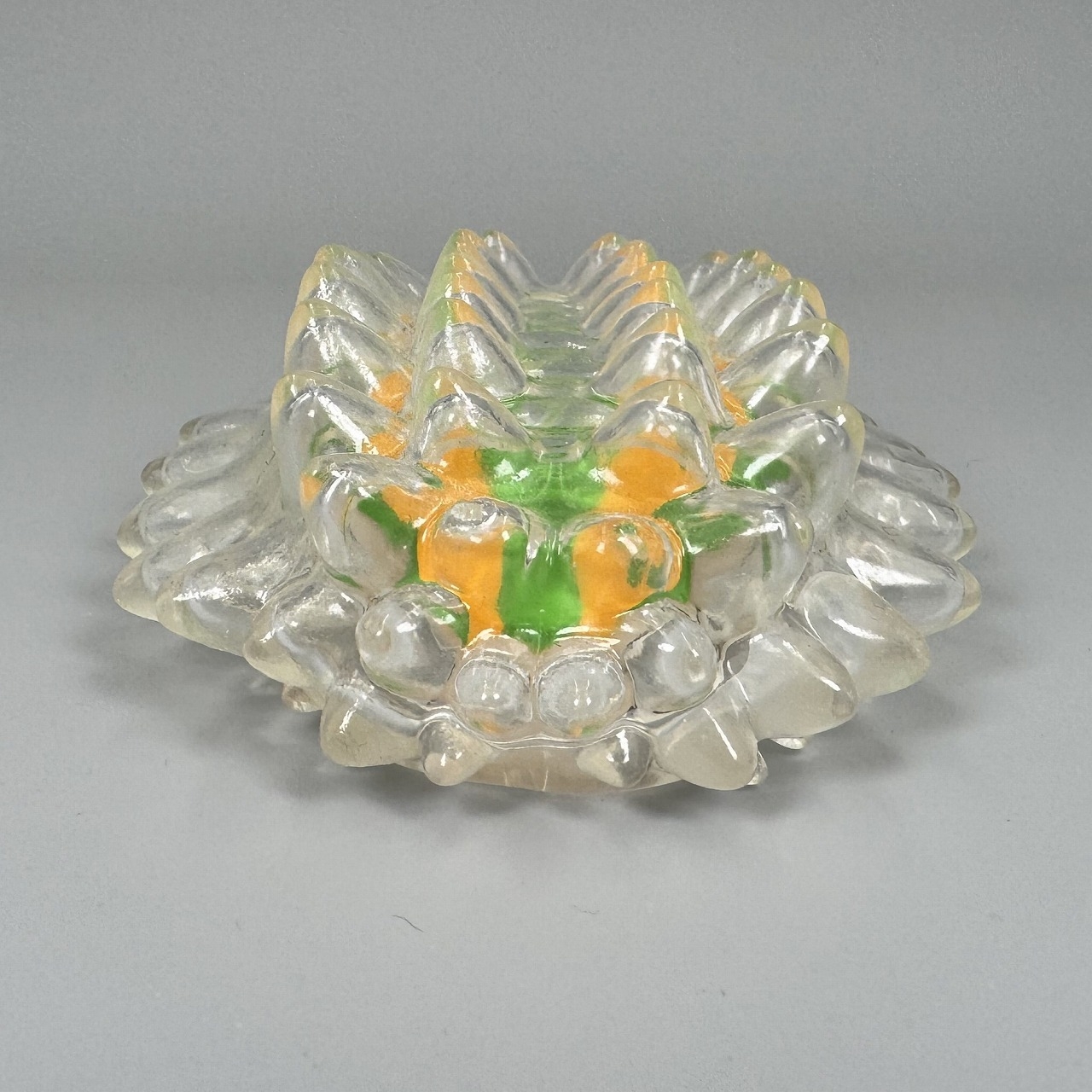 クリア素材で特徴的な粘液を表現し、本体は蓄光ソフビで表現。粘液部分と本体部分は分離した構造。