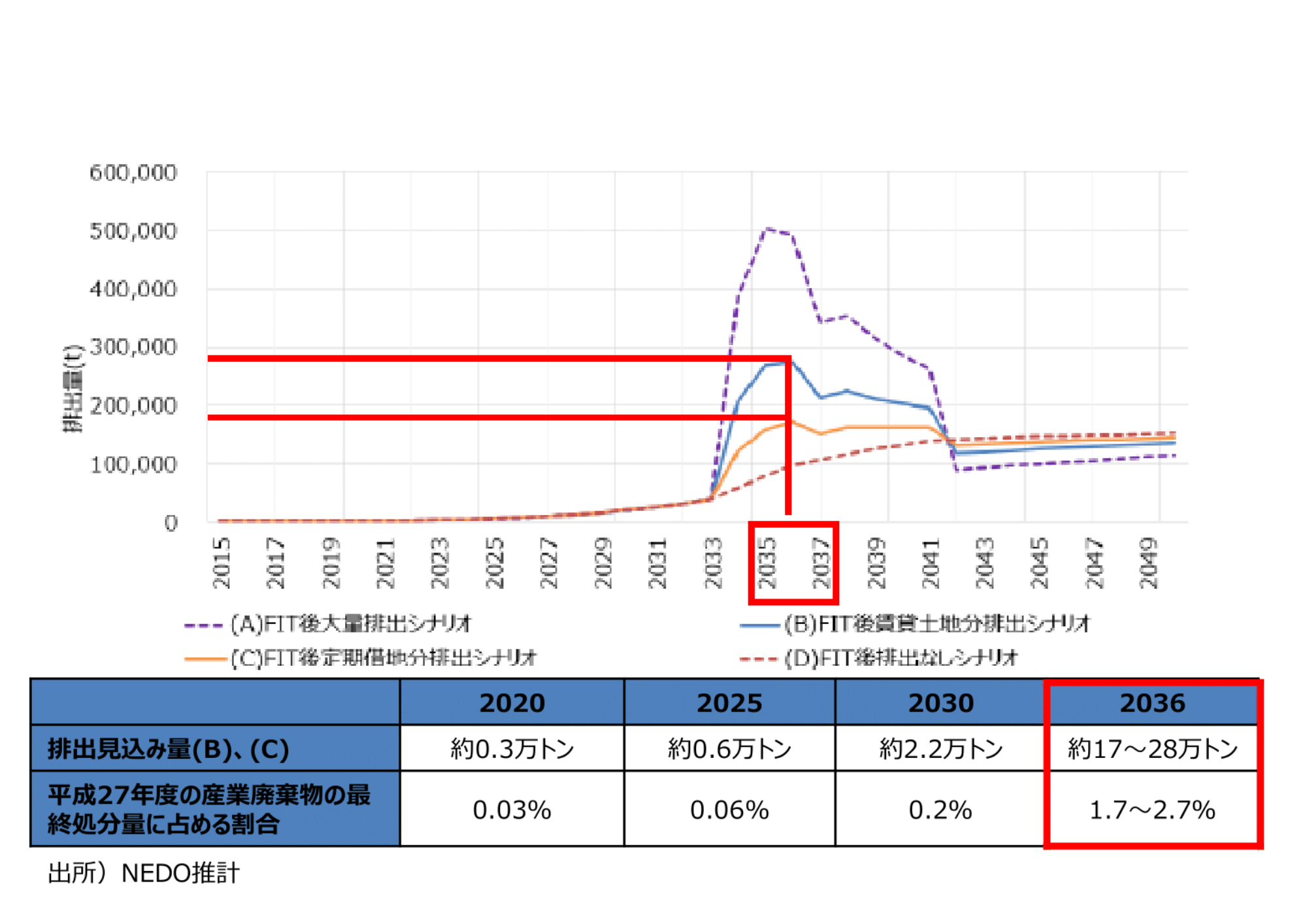 ※現在予測されている太陽光パネルが産業廃棄物の最終処分量に占める割合。2030年代後半には太陽光パネルが最終処分量に占める量は約30tを占め、「大量廃棄時代」を迎えるとされている。(出典:経済産業省)