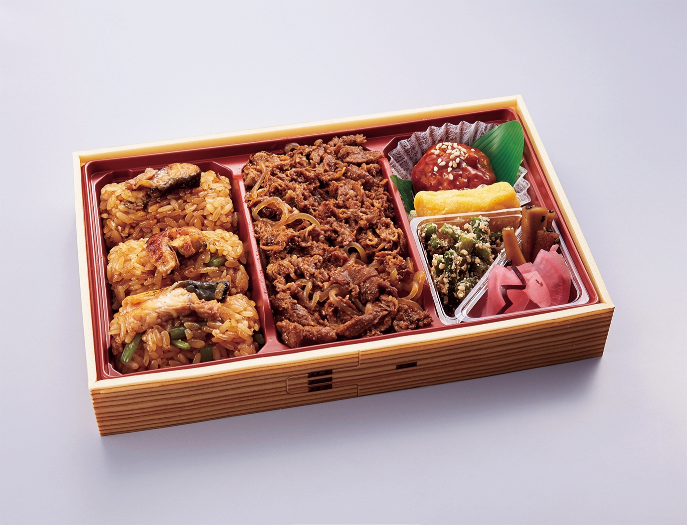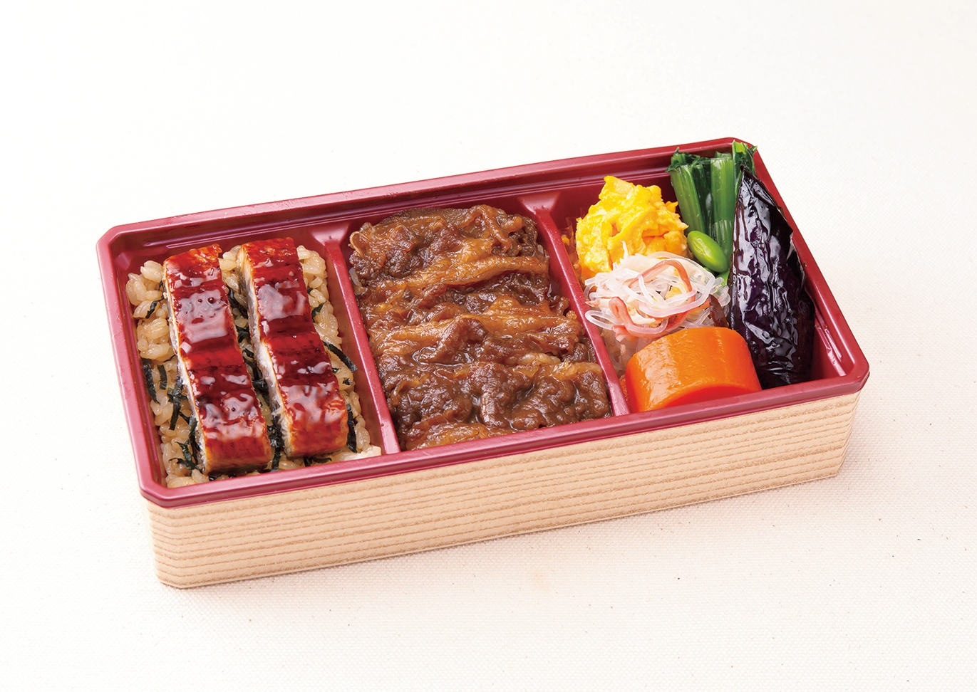 ご飯の上にうなぎの蒲焼と柿安自慢の黒毛和牛をのせた贅沢なお弁当です。