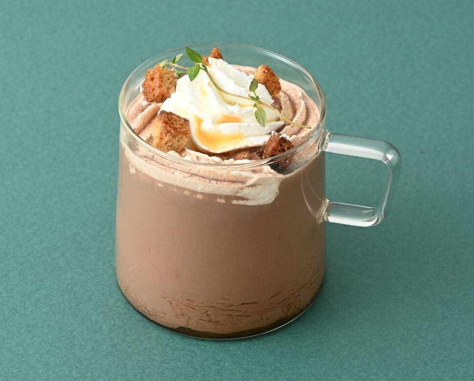 ホットココアにジンジャーを効かせたスパイシーなドリンク。隠し味として、香辛料のカルダモンが効いています。小麦粉とライ麦粉を使用したパンである「ミッシュブロート」のクルトンが食感のアクセントに。寒い日に飲みたくなるおすすめのホットドリンクです。