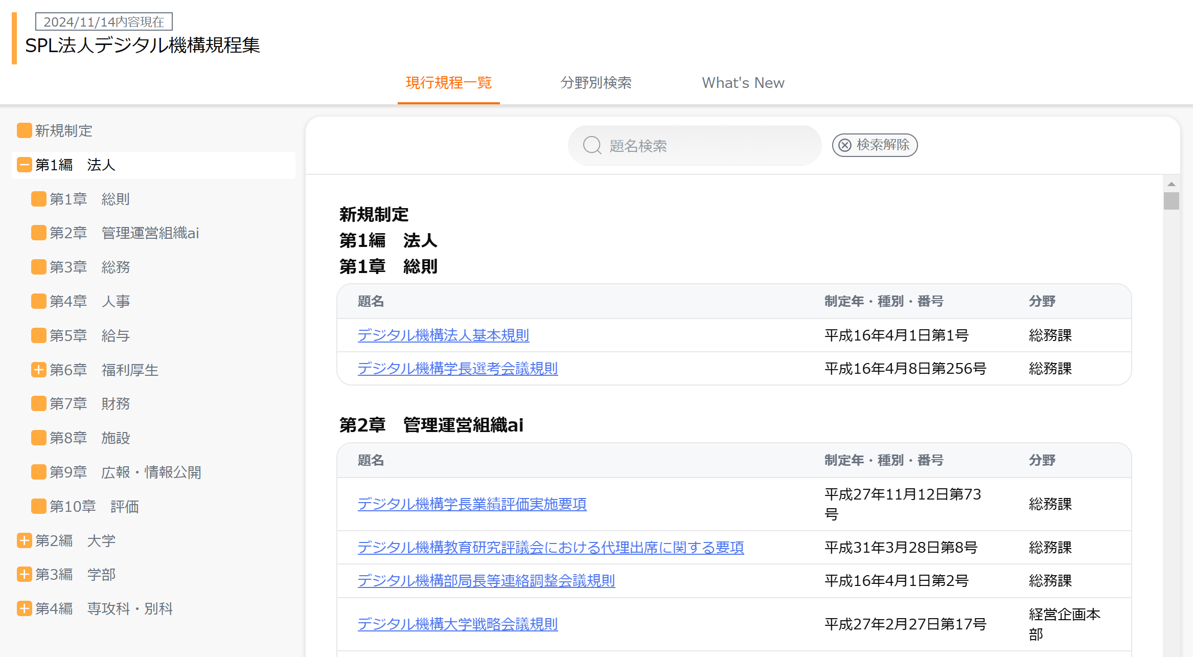 ・業務支援機能 :法規業務の作業フローを支援し、規程集の管理や更新が容易に