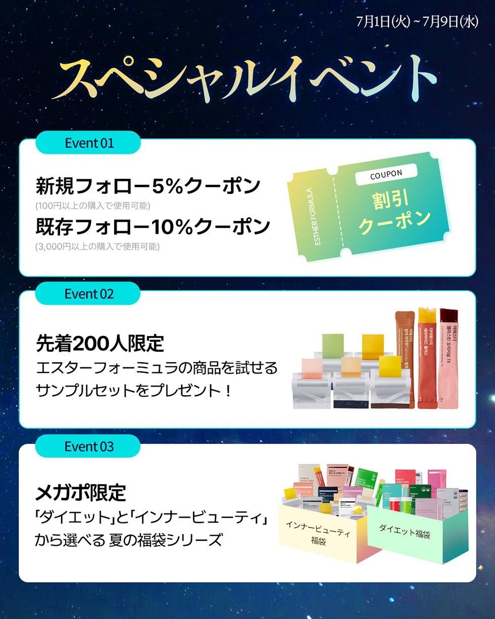 このたび2025年7月1日(火)から7月9日(水)まで開催されるQoo10メガポではおまけ付きスペシャルコラボ企画セット、そして今回の目玉、夏限定選べる福袋(インナービューティー、ダイエット)が登場します。メガポ限定セールでお得に購入して、この夏は新しい自分を手に入れましょう!その他、豪華イベントも実施いたしますのでこの機会をぜひお見逃しなく!