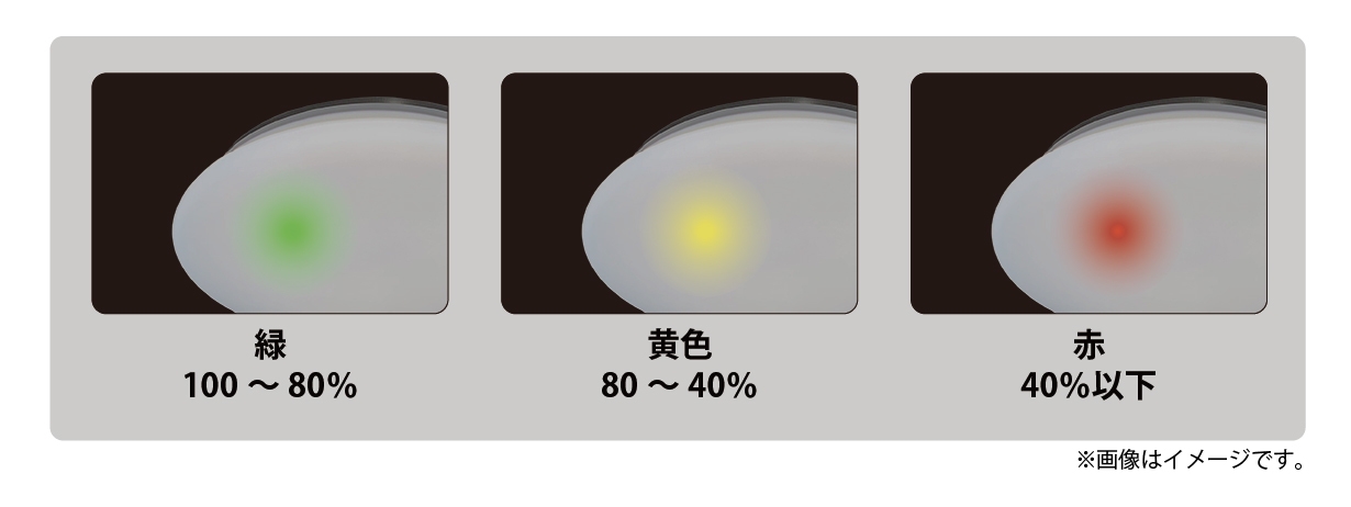 消灯後、2~3秒間、器具内のLEDインジケーターが点灯し、バッテリーの残量が確認できます。