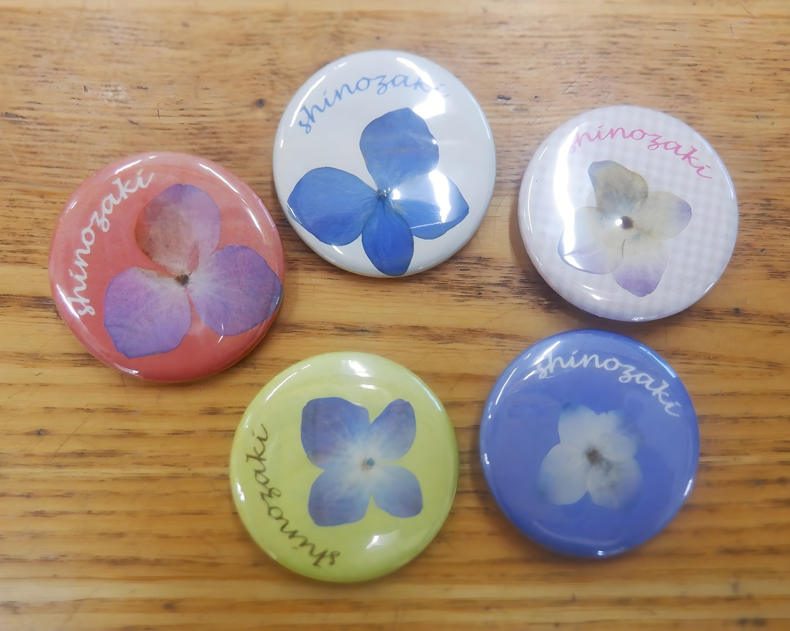 スタンプを全て集めると景品の押し花アジサイ缶バッジをプレゼント!
