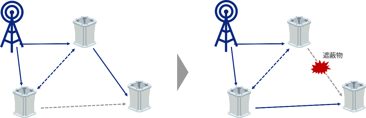 本中継器は、複数の方向から受信するミリ波電波のうち、最も無線品質の良い中継ルートを選択し、メッシュ状のエリアを形成します。ミリ波基地局または隣接の中継器から受信する信号の劣化を検知した場合、最適な中継ルートを計算し、瞬時に切り替えを行います。建物建設や樹木などの環境変化により中継ルートが遮蔽された場合も、常に最適な中継ルートを自律的に選択し、最適化を行います。