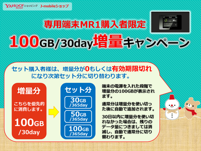 ジャパンモバイル株式会社(本社:札幌市中央区、代表取締役社長:賣場崇大、以下「J-mobile」)は、2023年12月6日から2024年1月31日までの期間内に、Yahoo!ショッピング『J-mobileショップ』にて絶賛販売中の『プリペイドWiFi専用端末MR1』をご購入いただいたお客様に『クリスマス・年末年始にガッツリ使えるデータチャージ100GB/30day』をプレゼント致します。(※予定販売台数に到達次第、キャンペーンを終了する場合がございますので、あらかじめご了承ください。)