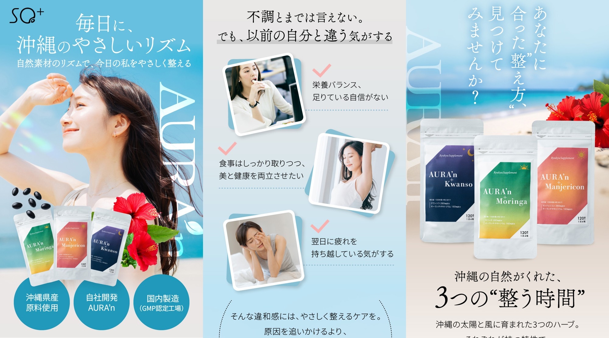 今回Ryuki Designが制作を担当した「RyukyuSupplement」は、このAURA’nをベースに、沖縄県産ハーブのモリンガ・マンジェリコン・クワンソウを組み合わせたサプリメントブランドです。LPでは、SoPros社の「沖縄の自然素材で健康を支える」という理念をビジュアルとコピーでわかりやすく表現し、ブランドメッセージを的確に届ける構成としました。
